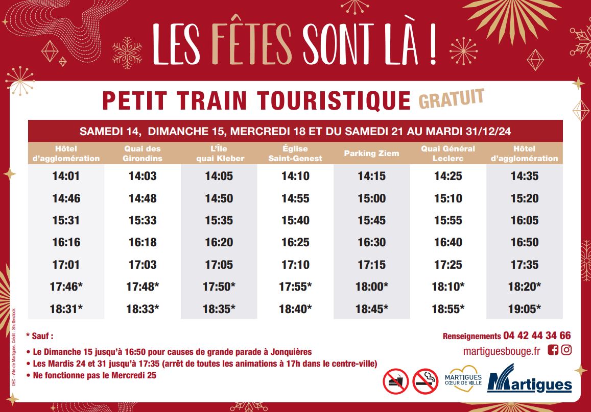 De forma gratuita y sin necesidad de reservar, durante las vacaciones de Navidad y verano podrá tomar el trenecito eléctrico para descubrir el centro de Martigues. 100% eléctrico, equipado con paneles solares, es autónomo durante 180 km. Capacidad para 85 personas.